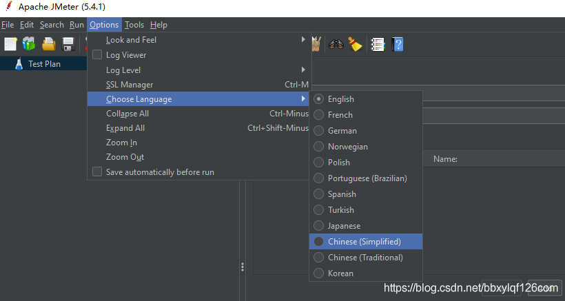 JMeter支持简体中文操作,我们在工具栏选择Options->Choose Language->Chinese(Simplified),