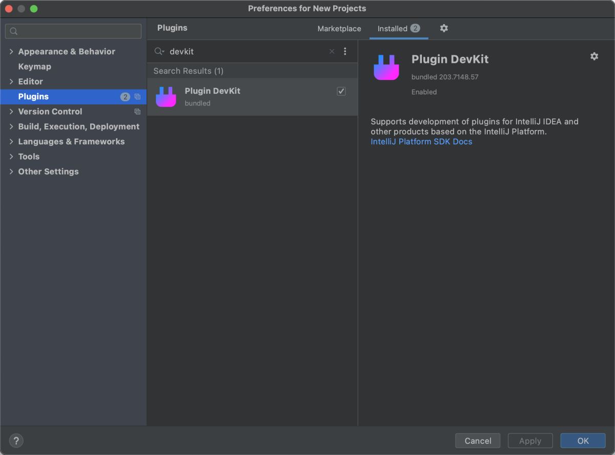 正如Java开发需要安装Java DevKit,IDEA插件开发也需要安装Plugin DevKit。PDK的作用是为插件提供IDEA内建支持以及相关库函数。