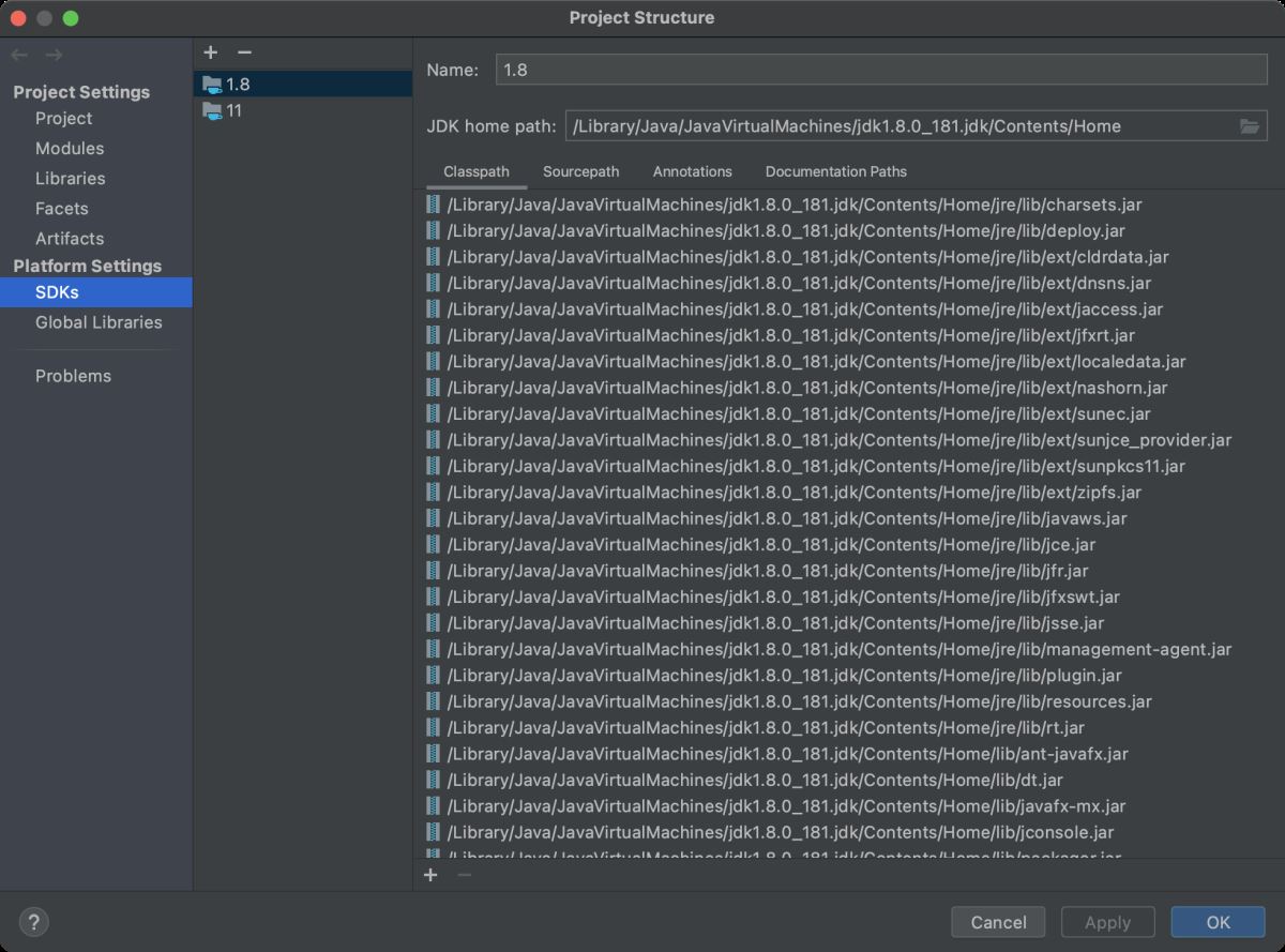 切换到 File --> Project Structure,选择左侧栏 Platform Settings 下的 SDKs,点击+按钮,先选择 Add JDK,指定 JDK 的路径;再选择Add IntelliJ Platform Plugin SDK,指定上面添加的JDK为插件需要的JDK。需要注意的是,从IDEA 2020.3开始,不能再使用Java1.8版本。因为IDEA 2020.3版本基于Java11构建,所以如果想要开发2020.3及以后版本的IDEA的插件,需要选择Java11版本。