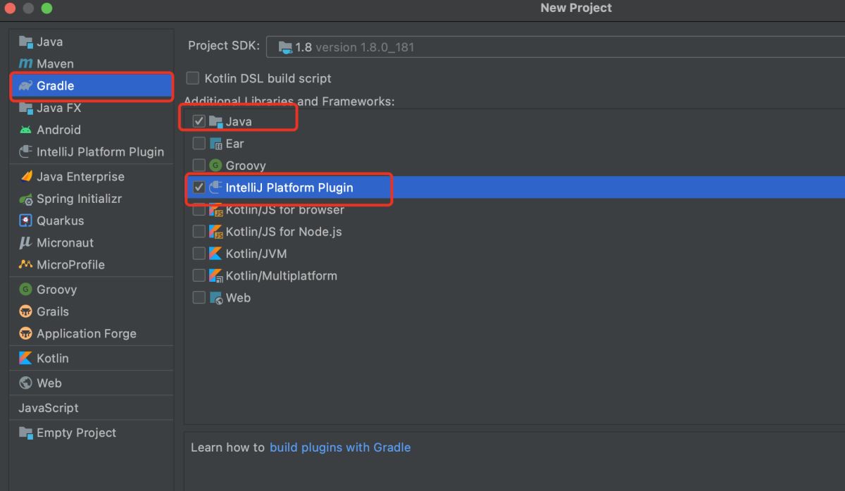 File --> New --> Project,在弹出的窗口中选择Gradle,然后选择Java(这表明我们使用Java语言开发)和Intellij Platform Plugin,点击Next,然后设置项目的名称和位置,点击Finish完成创建。