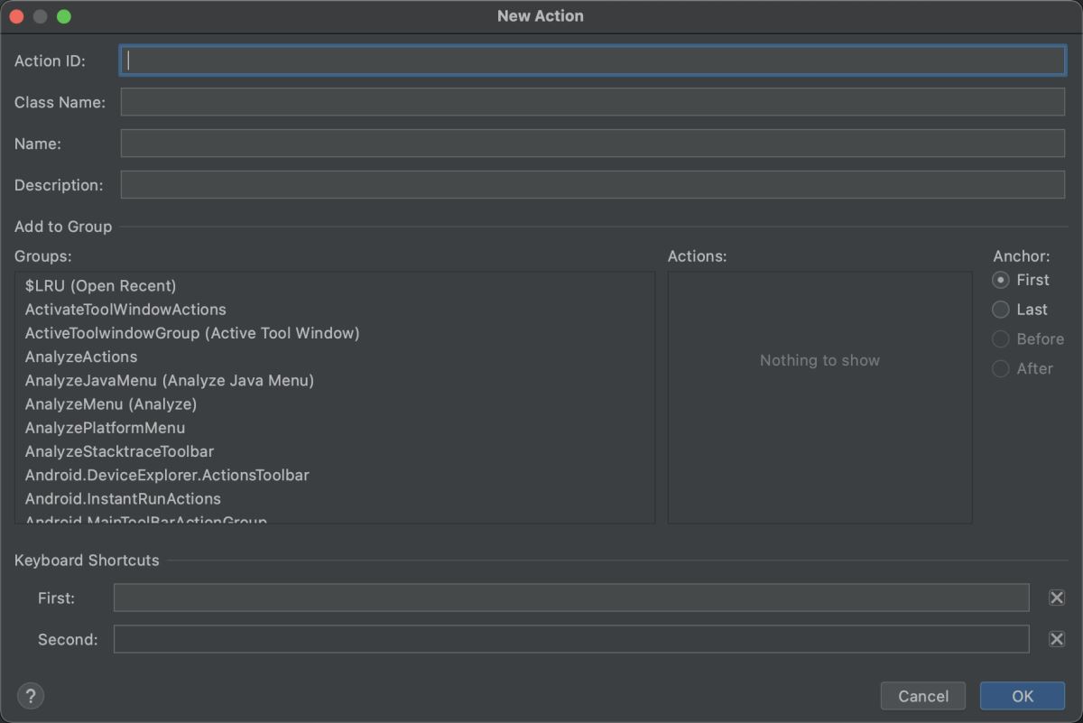 我们在IntelliJ自定义的插件可以添加到菜单项目(如右键菜单中)或者是放在工具栏中。当用户点击时触发一个动作事件,IntelliJ则会回调AnAction子类的actionPerformed函数。因此我们只需重写actionPerformed函数即可。我们可以认为Action是插件的触发入口。我们可以直接右键New --> Plugin DevKit --> Action新建action,这个action是AnAction的子类。