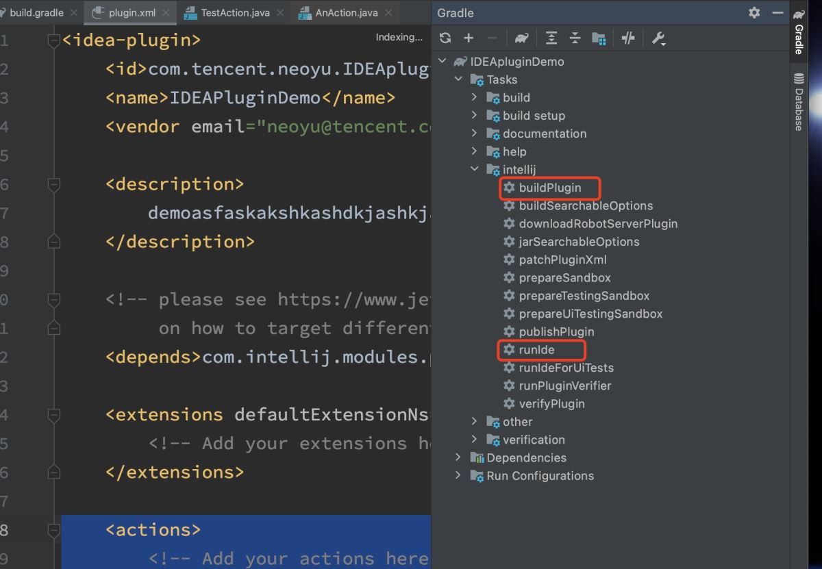 创建完之后,我们也可以在src/resources/META-INF/plugin.xml中,看到我们之前写入的action信息,如果想要修改,可以在这个配置文件中直接修改。