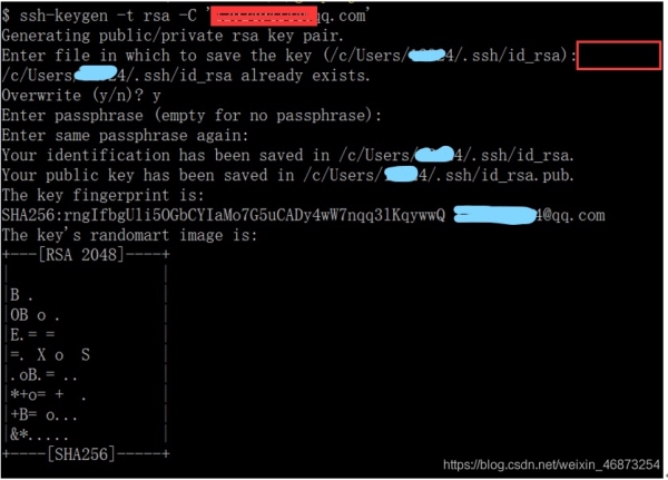 注意: 如果 C:Usershwm.ssh目录中, 已经配置过ssh, 有ssh文件, 在执行命令的时候, 不能默认按3个回车, 否则会覆盖之前的ssh配置相关文件, 需要手动设置, 下方截图红框中, 生成文件的名称.