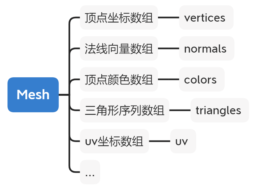 从概念上讲,网格是图形硬件用来绘制复杂内容的构造。它至少包含一组定义3D空间中点的顶点,以及一组连接这些点的三角形,实际上还包含法线、顶点颜色纹理坐标等信息,这些三角形构成了网格所代表的任何表面。