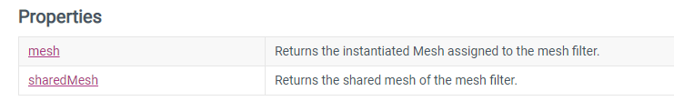 我们查看Unity的官方手册,看看mesh与sharedMesh的区别:https://docs.unity3d.com/ScriptReference/MeshFilter.html