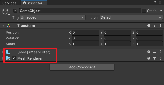 在Unity中,我们要显示一个网格,需要用到两个组件:MeshFilter和MeshRenderer。