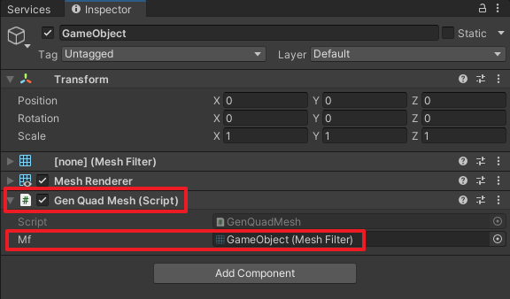 再挂上我们上面写的GenQuadMesh脚本,赋值mf变量为MeshFilter对象,如下