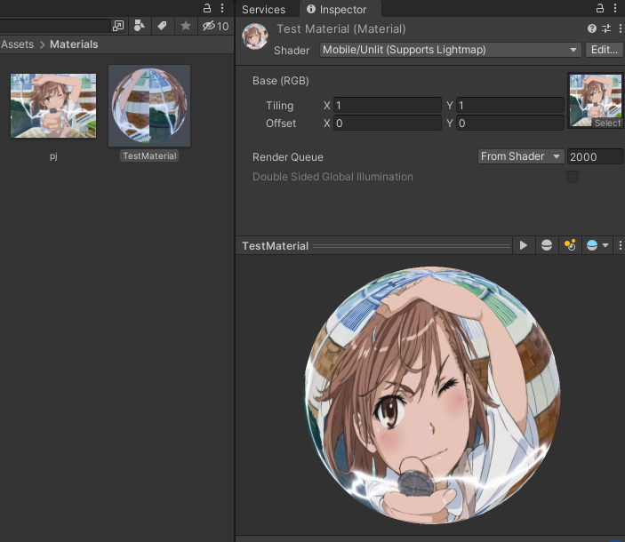 上面之所以显示紫色块,是因为我们没有给MeshFilter设置材质球,顺手做一个炮姐的材质球吧,