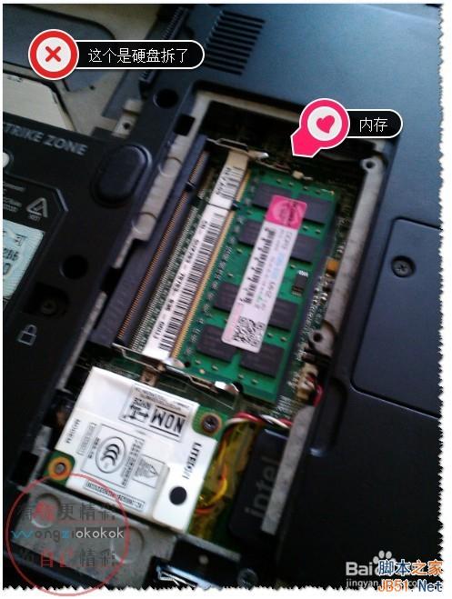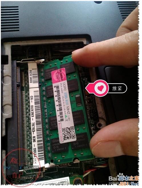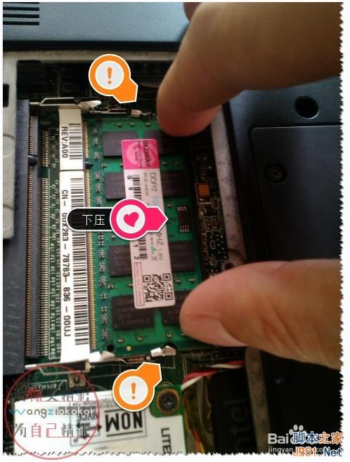 3、如果你要增加内存条,注意先装下面的一个卡槽的内存。然后,再插上你就要增加的内存条(安装前用橡皮擦擦一下金属片(金手指))。注意:增加内存条时型号一写要对的内存,最好是同品牌哦!!!