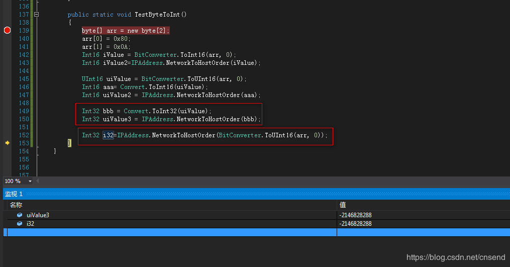 原因是:以下两种写法是等价的,IPAddress.NetworkToHostOrder()不能接收UInt16类型,所以把BitConverter.ToUInt16(arr, 0)强制转化成Int32再转序的。