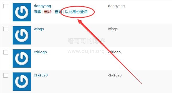 刷新 WordPress 后台,进入用户管理,你就会发现多了一个“以此身份登录”的按钮,点一下就自动退出管理员账号,并免密码以该账号登录。