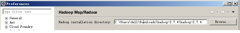 2)启动eclipse,点开Windows->preferences,弹出如下对话框,设置hadoop的安装目录。