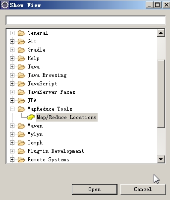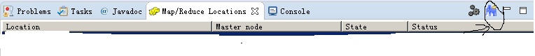 在其中选中Map/ReduceLocations,点击Open后将成功添加Map/ReduceLocations窗口,点击右侧的小象图标创建New Hadoop Location,如下图: