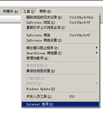 1.打开IE浏览器,在“工具”菜单中选择“Internet选项”效果如下图