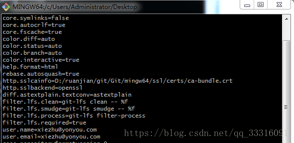 安装完成之后,还需要最后一步设置,在命令行输入git config --list,如果最后两行信息和你之前输入的相同,则完成了git的基本配置。