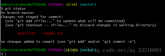 上面的命令告诉我们readme.txt文件已经被修改,但是未被提交。注意看中间字的颜色,红色表面还没有提交到暂存区,绿色表明已经添加到了暂存区。