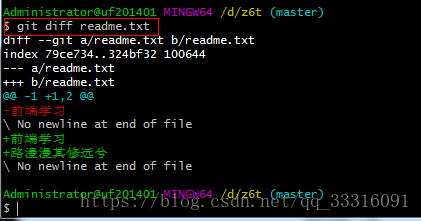 接下来想看下readme.txt到底做了什么修改,如何查看呢?使用git diff readme.txt如下:
