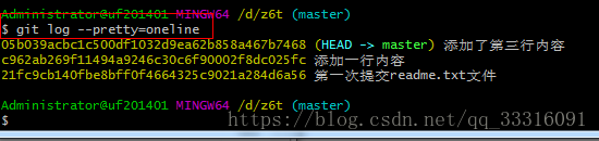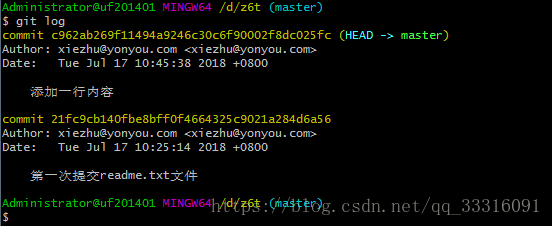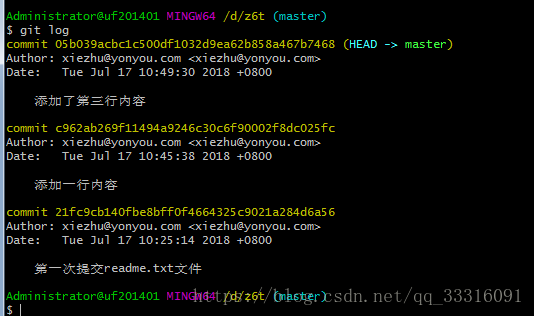 现在对readme文件做了多次修改,下面我们查看下历史记录,如何查,我们可以使用git log命令。