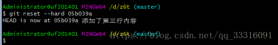 通过上面显示我们可以知道,添加第三行的版本号是05b039a ,现在可以使用命令git reset --hard 05b039a 来恢复,演示如下: