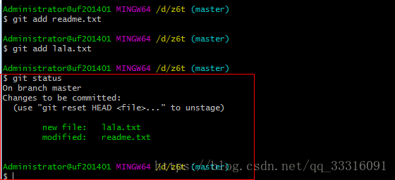 现在使用git add 命令把两个文件都添加到暂存区中,在使用git status来查看状态,如下: