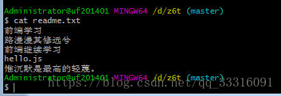 比我现在在readme.txt文件里面增加一行内容为(惟沉默是最高的轻蔑。),我们先通过命令查看如下: