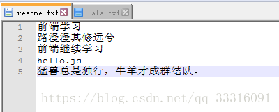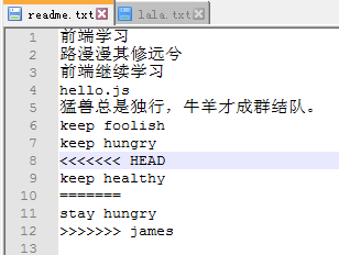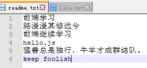 对于上面的第二种情况,继续做demo来看下,假如对readme.txt添加一行内容为(猛兽总是独行,牛羊才成群结队。)