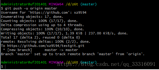 现在,根据github的提示,在本地仓库下运行以下命令,输入github用户名,密码: