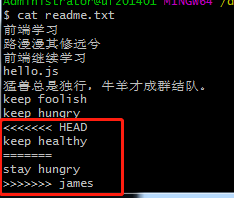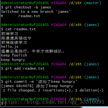 首先创建一个新分支,比如名字叫做james,在readme.txt添加一行内容keep hungry,然后提交,如下所示: