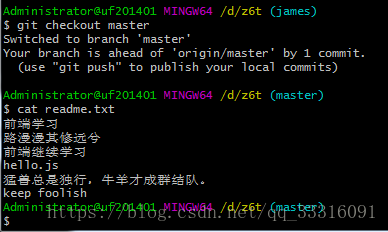 在add和commit readme.txt后需要在master分支上合并james,如下: