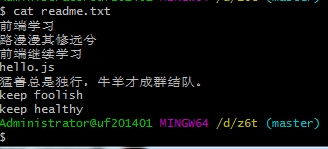 同样,现在切换到master分支上来,查看此时的内容为keep hungry的内容,如下: