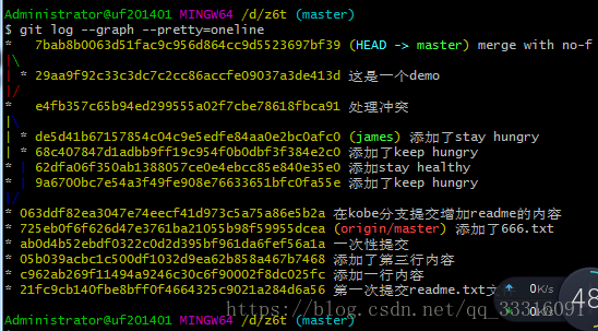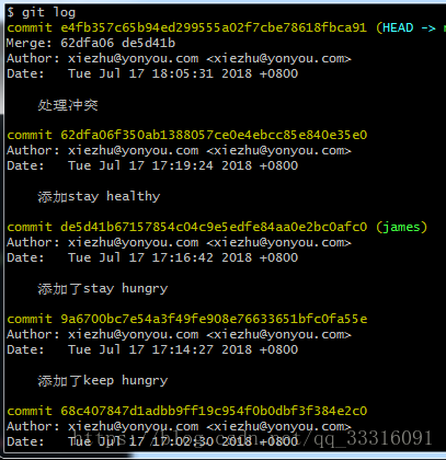 查看分支合并情况,使用git log 如下: