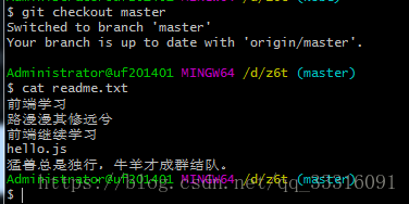 此时切换到master分支并查看readme.txt