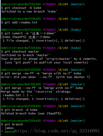 创建一个kobe分支。修改readme.txt的内容。添加到暂存区。切换回主分支(master)。合并dev分支,使用命令git merge --no-ff -m “注释” dev查看历史记录