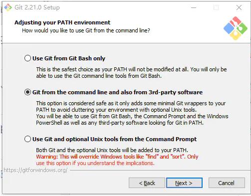 选项三,会将git相关程序以及一些其他的Unix工具加入系统环境变量,使得Windows系统cmd命令行中可以使用git以及Unix工具。要注意的是,这将覆盖Windows工具,如 “ find 和 sort ”。只有在了解其含义后才使用此选项。