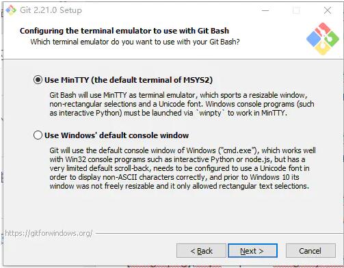 选项一,Git Bash将使用MinTTY作为终端模拟器,该模拟器具有可调整大小的窗口,非矩形选区和Unicode字体