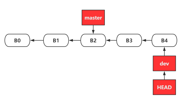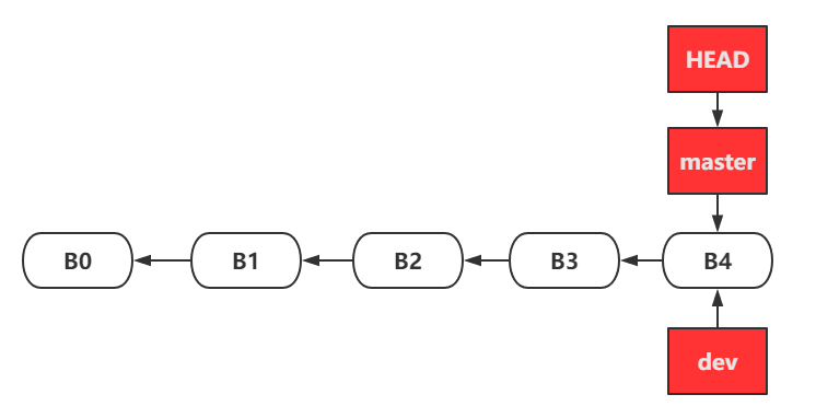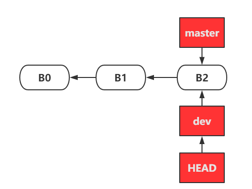因为是在B2创建 dev,所以新分支 dev 指向B2。另外从分支 master 切换到分支 dev,所以HEAD指向当前分支 dev。