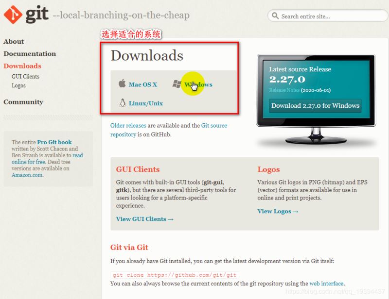 2、选择合适的操作系统(本教程是以 Windows 系统为例),选择 【Windows】(会根据目前的系统自行识别),等待 Git 的GUI 软件下载,目前的版本是 v 2.27。