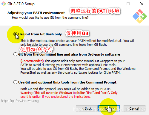 7、选择 Git 的执行环境路径,此处默认使用【命令行】的方式就好,点击【Next】.