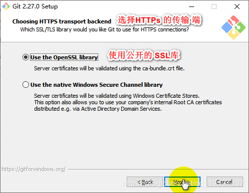 8、选择 HTTPS 的传输端,默认使用【Use the openSSL library】,点击【Next】。