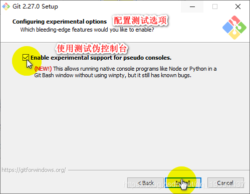 13、配置测试选项,此处勾选【Enable experimental support for pseudo consoles】,点击【Install】,等待按照即可。
