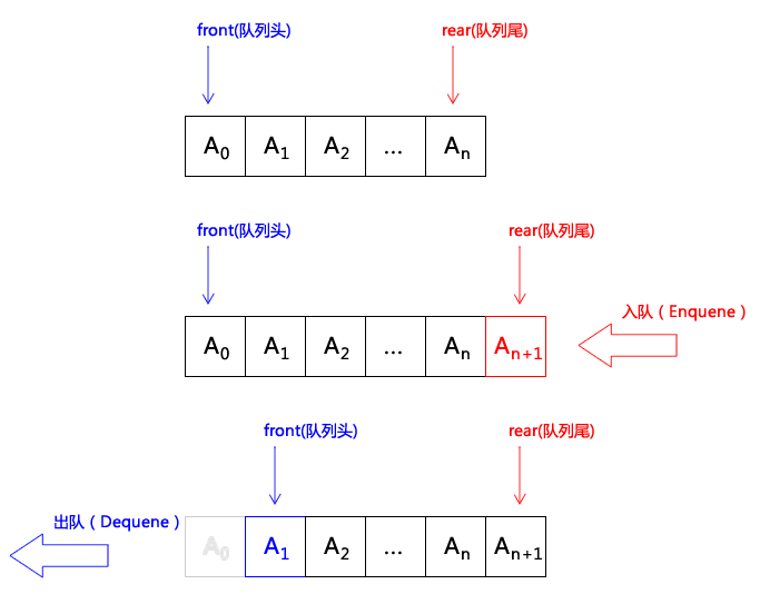 实现思路:用一个数组存放所有元素,同时设置二个关键变量front与rear用于记录队列“头”与“尾”的元素下标,当有元素入列时rear加1,当有元素出队时front+1,而rear-front即为队列实际元素的总数.