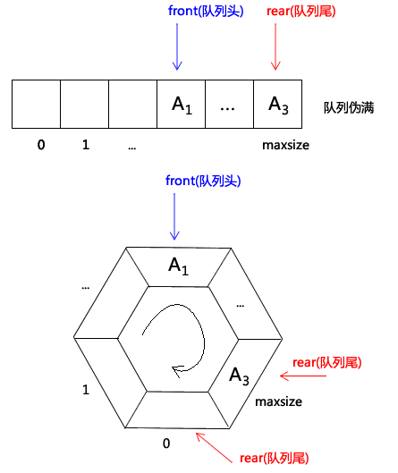 这张图上面的部分:假设经过入队、出队一番折腾后,rear已经指向数组的下标最大值,而front指向在中间(即front之间的元素已经出队不用考虑了,相当于front下标前面的内存区域空闲),如果这时再有一个元素入列,rear+1就超出数组下标的最大值了,但是从图上一眼就能看出,实际上front前面还空着一堆位置可以重复利用,队列并非真正的“满”--这种情况称为伪满,为了解决这个问题,我们可以把数组想象为首尾相接的循环结构,即图中下面部分,这时候可以让rear重新指向到0,以便重复利用空闲的位置。