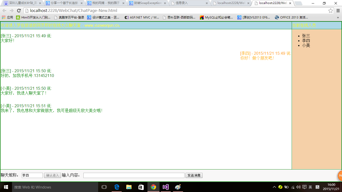 实现网页版的在线聊天室的方法有很多,在没有来到HTML5之前,常见的有:定时轮询、长连接+长轮询、基于第三方插件(如FLASH的Socket),而如果是HTML5,则比较简单,可以直接使用WebSocket,当然HTML5目前在PC端并没有被所有浏览器支持,所以我的这个聊天室仍是基于长连接+长轮询+原生的JS及AJAX实现的多人在线即时交流聊天室,这个聊天室其实是我上周周末完成的,功能简单,可能有些不足,但可以满足在线即时聊天需求,分享也是给大家提供一个思路,大家可以基于此来实现更好的在线即时聊天工具。