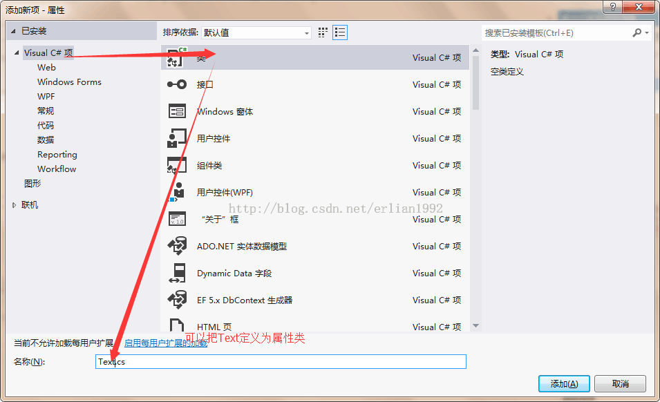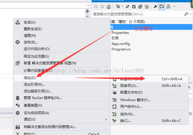 (1)在打开的主窗口右击你所创建的属性类,选中添加,再选中新建项