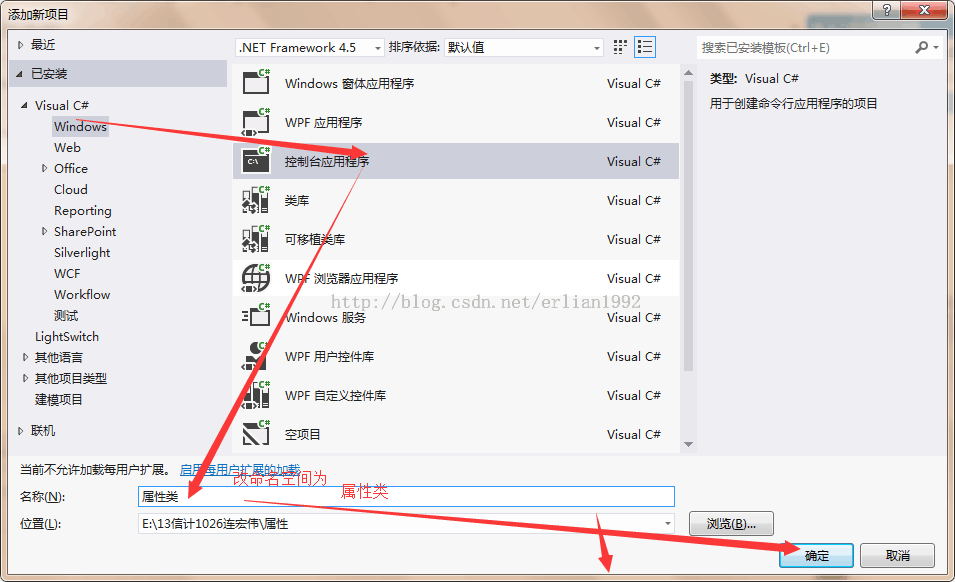 (2)在新的窗口中继续点击控制台应用程序,然后改命名空间为属性类,单击确定