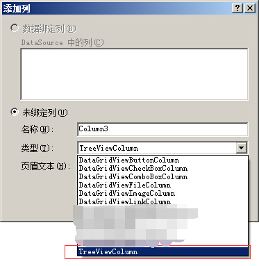 当编辑无误后,可以在添加列的时候看到TreeViewColumn类型。此类型暴露出一个_root属性,可以绑定外部的一个带数据的TreeView。