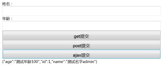 <form > 姓名:<input name="name" type="text"/> 年龄:<input name="age" type="text"/> <input type="button" class="get" value="get提交"/> <input type="button" class="post" value="post提交"/> <input type="button" class="ajax" value="ajax提交"/> </form> <div id="box"></div>