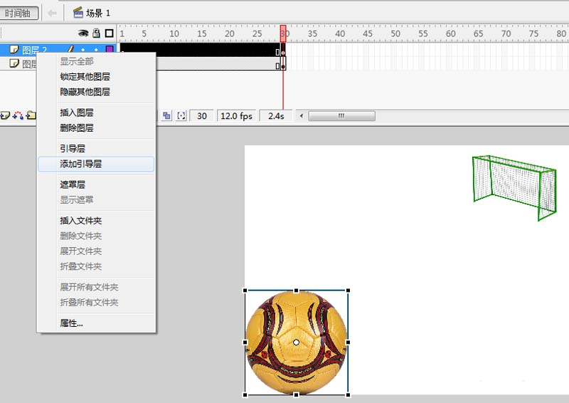 4、调整其位置为左下角,分别在图层1和图层2的30帧处插入关键帧,右键单击图层2,选择添加引导层选项。