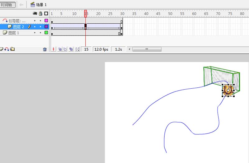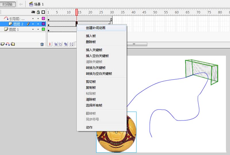 6、接着选择30帧处,将足球放在曲线的末尾,在1-30帧之间创建传统补间动画。