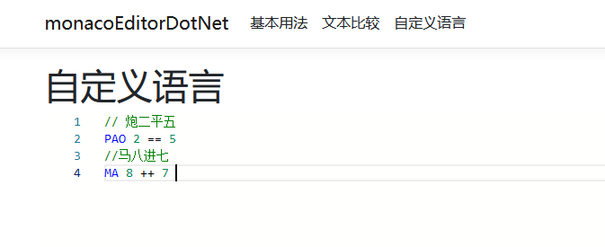 monaco editor 支持常见的几乎所有编程语言,在编辑这些语言的代码时可以高亮显示关键字,同时也支持对自定义语言的扩展。其功能非常强大,同时配置起来也比较复杂,这里只举个简单的例子,说明如何使用。